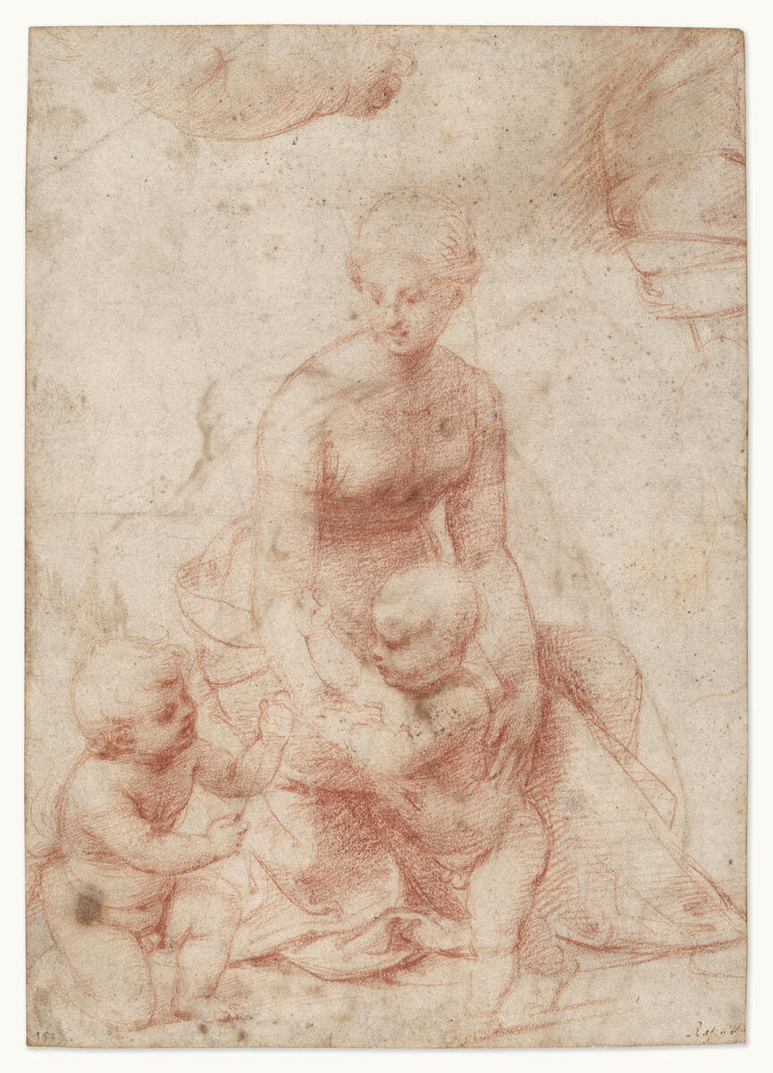 This delicately rendered sheet focuses on a composition study for the Madonna in the Meadow, a painting in the Kunsthistorisches Museum in Vienna that is dated either 1505 or 1506. Along the top, the sheet also includes two fragmentary studies for related details of the composition. This is one of the artist's earliest drawings in red chalk. When the young Raphael arrived in Florence around 1503, after his first work in the regions of Umbria and the Marches which were considered provincial centers, he began to establish his reputation as an artist by painting numerous compositions of the Madonna and Child.